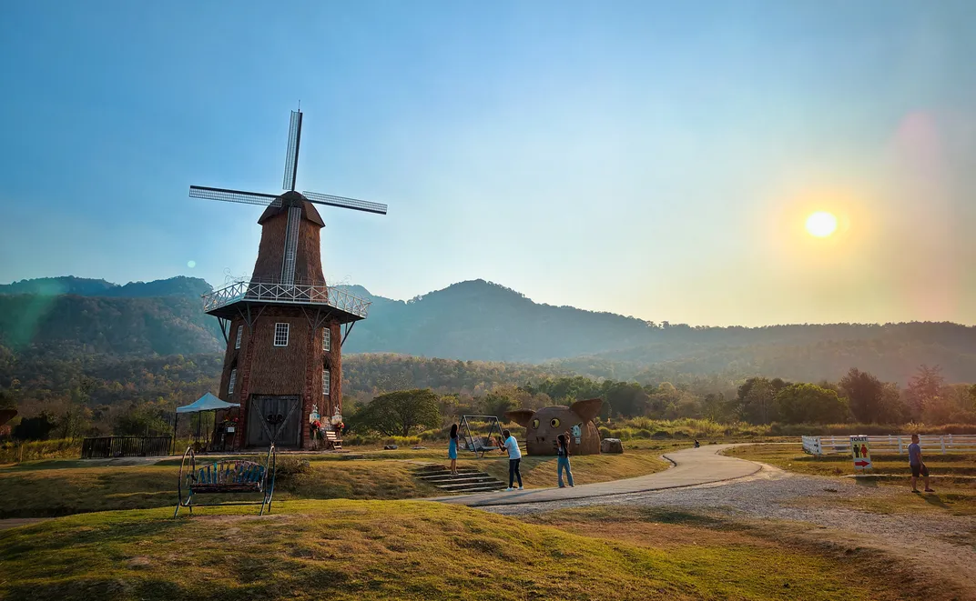 Wonderful resort in Chiang Mai city, beautiful scenery, tourists taking photos in front of the big windmill. The whole environment is like a fairy tale world!
