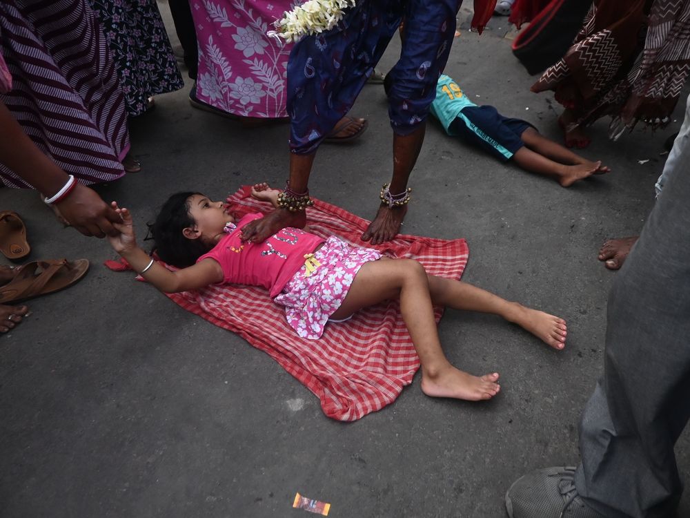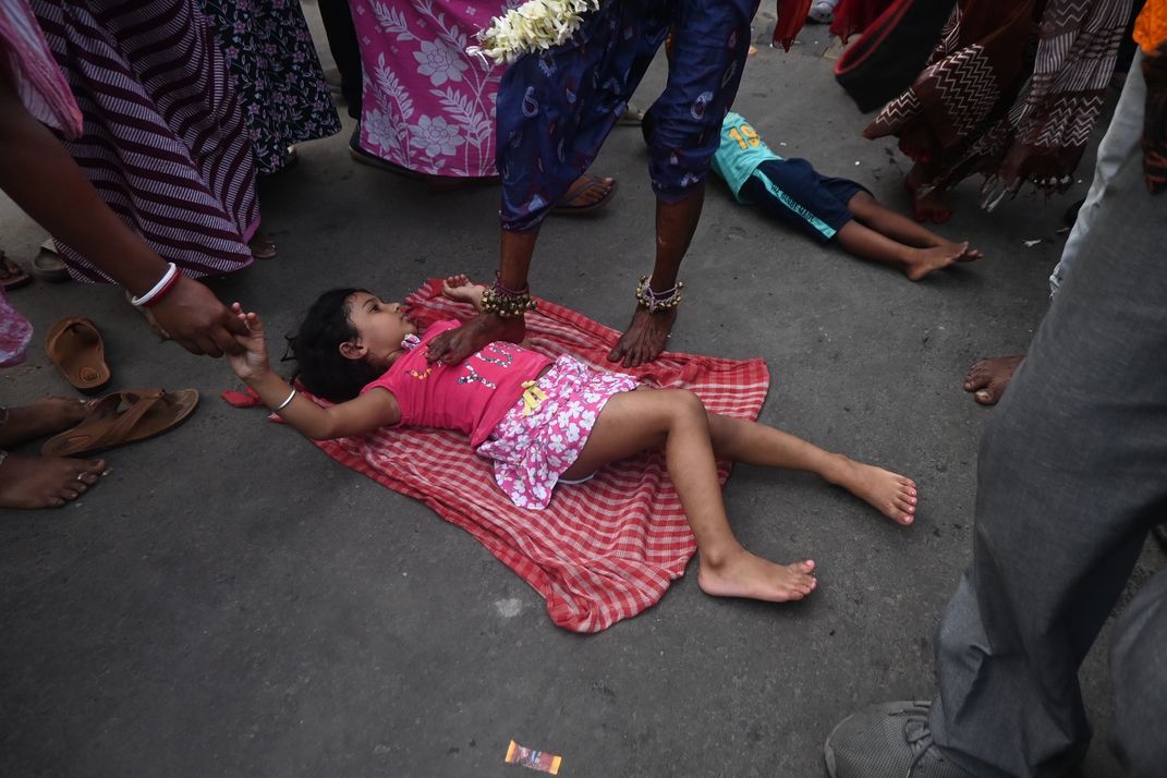 Gajan is a Hindu festival celebrated in India. The photograph depicts a moment when a child receives blessings from a chosen one. He touches the child with his foot. The entire event is extremely interesting from a photographer's point of view.