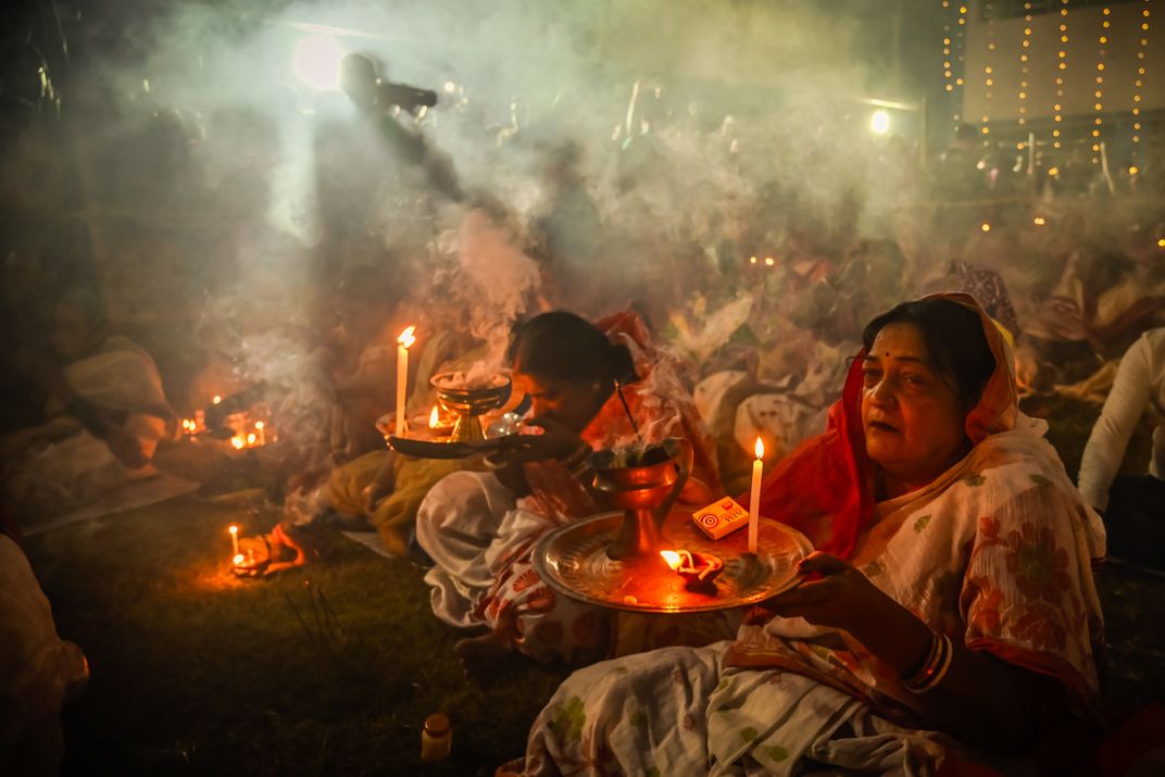 Devotees observe 'Rakher Upobash' (or Kartik Brati), a fast dedicated to the 18th-century saint Baba Lokenath. Sitting in rows, they light oil lamps and burn traditional incense. The heavy smoke is believed to carry their prayers to the divine, creating a surreal, spiritual atmosphere.