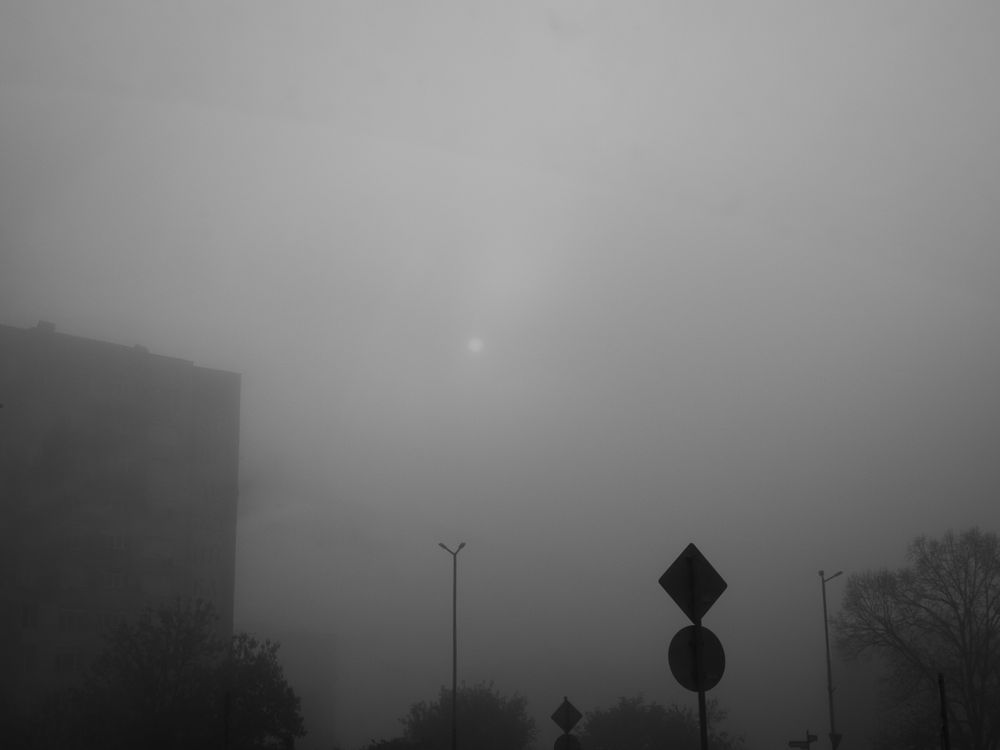 The 'ghost' of the urban world. The rigid structures of the city, once a 'hive,' are now seen 'falling' into the fog, beginning their material dissolution.