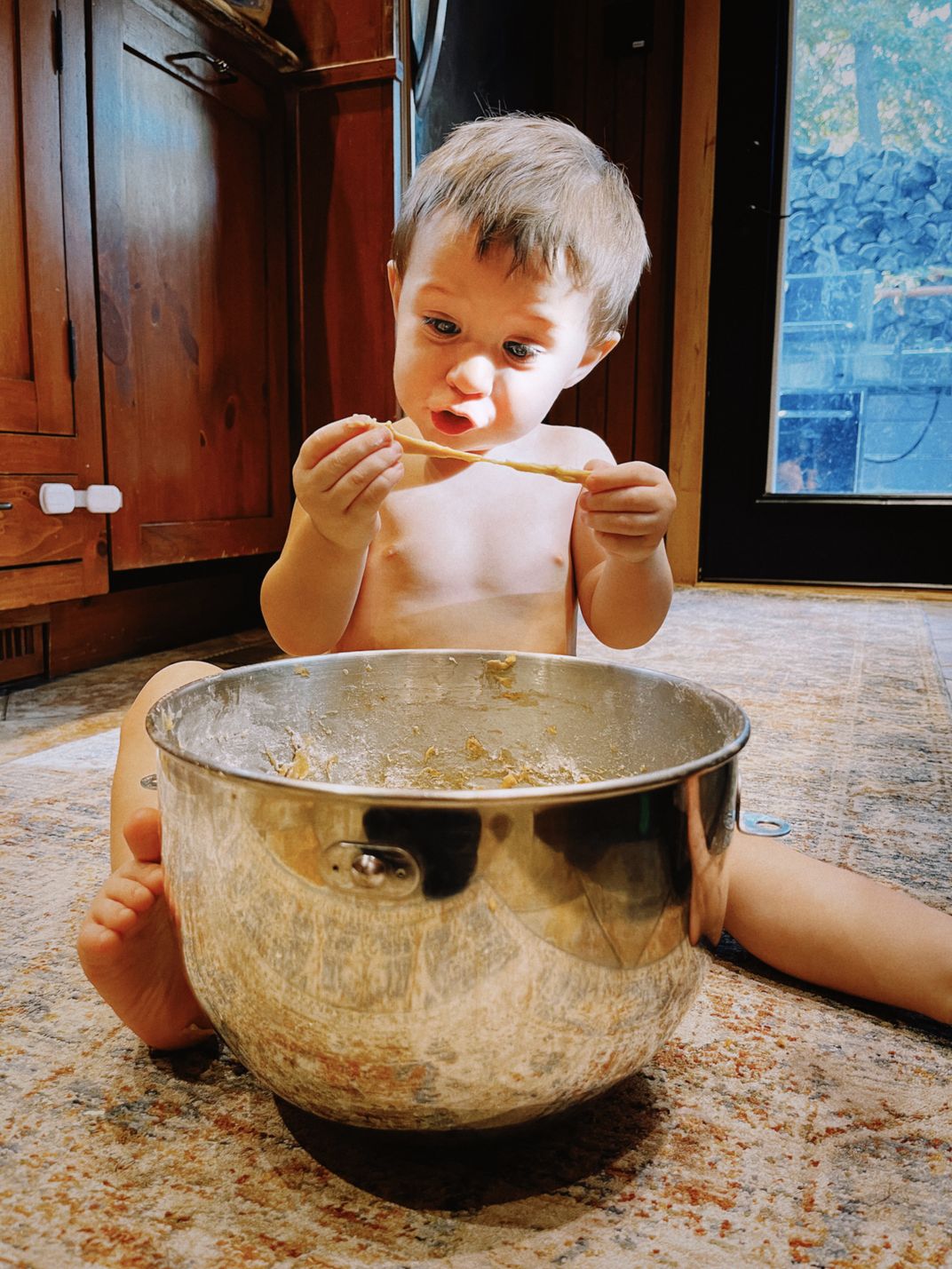 I am a SAHM who loves to bake and decided to let my son join in on kneading the cinnamon roll dough. He kept pulling it apart and going “ooooo”