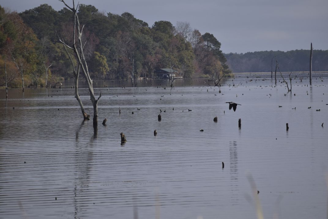 Fall colors come late in the year this far south. This picture taken in December and show the colors along the shoreline of Lake Seminole, the trees and stumps in the water, ducks swimming, and a bird flying across the frame. There is a covered boat dock across the way behind someones cabin on the Lake.