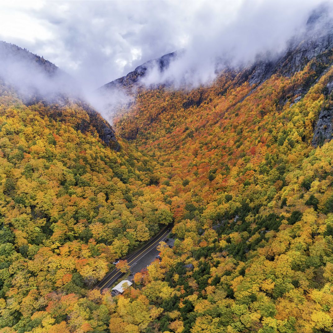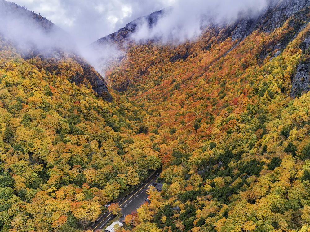 Aerial shot of the fall colors in Smugglers Notch state park after a rainy day.