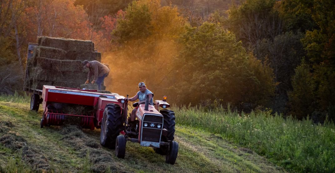 My wife and I traveled to southwestern Wisconsin for my birthday in early October. This is the unglaciated, hilly, and still mostly rural part of the state. Exploring the top of the hill where we were staying at sunset, we came across these 2 men harvesting their crop. They were curious about us (I had my camera on a tripod) and stopped to chat. We found out that they were an organic farm, which is typical of this area. The owner was very gracious to let me photograph anywhere on his property. I was unhappy with the original images of them, so returned the next afternoon and started shooting handheld. I kept shooting as they made repeated passes until sunset and finally caught this image. A few minutes later, the light was gone. I'm extremely glad I gave it a second try!