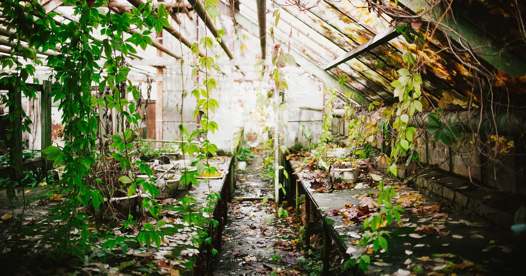 This abandoned greenhouse takes on a particularly melancholy appearance in autumn, when the neighboring trees shed their leaves all around. It has gradually begun to lose any traces of human presence and is increasingly being overtaken by wild plants. However, some of the plants abandoned by humans have also survived. All this creates a stunning local ecosystem.