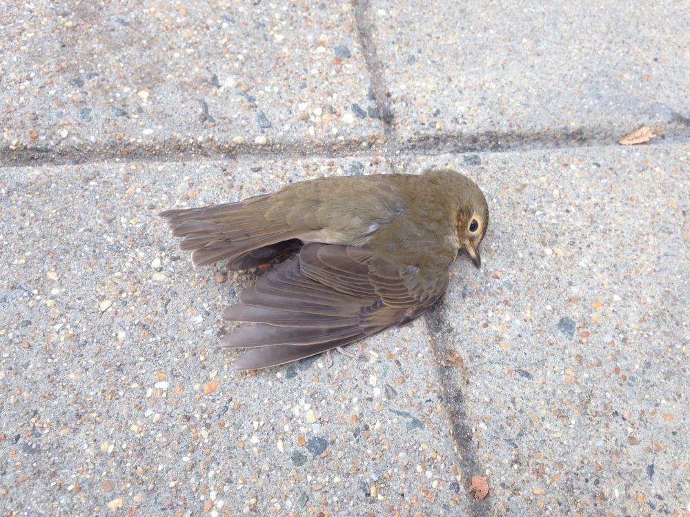 Often, animals do not survive manmade creations. It is likely that this bird had flown into a plate glass window and fell dead onto a busy sidewalk. It is in our nature to mourn death and this was my small gesture. After taking the photo, I moved the bird onto a bit of grass under a small tree.