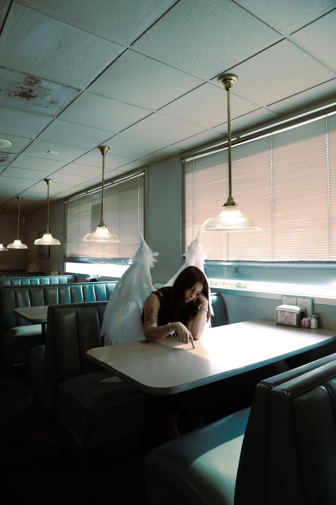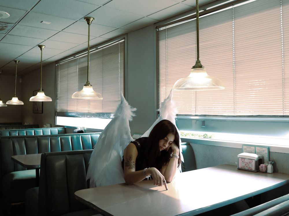 the quiet hum of an empty diner, an angel rests her head on the table — wings heavy, light fading. Fallen Hour speaks to the exhaustion of surviving, to the invisible weight so many carry in silence. It’s a portrait of stillness and struggle, a reminder that even those who seem ethereal can feel unbearably human.