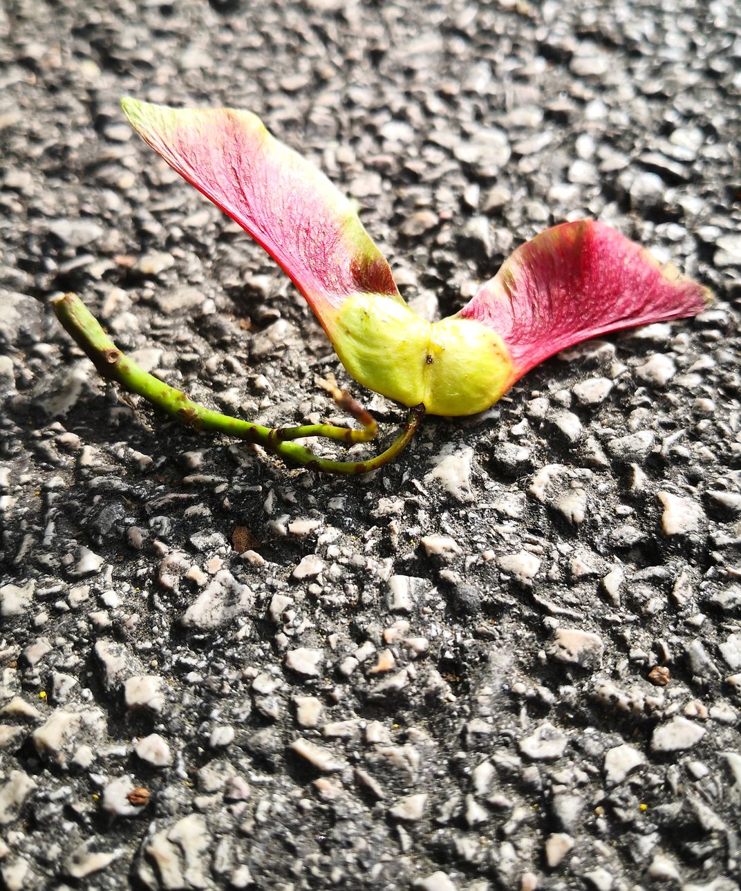 A seed pod resting on the asphalt, resembling delicate wings. A reminder of nature’s persistence even in urban surroundings.