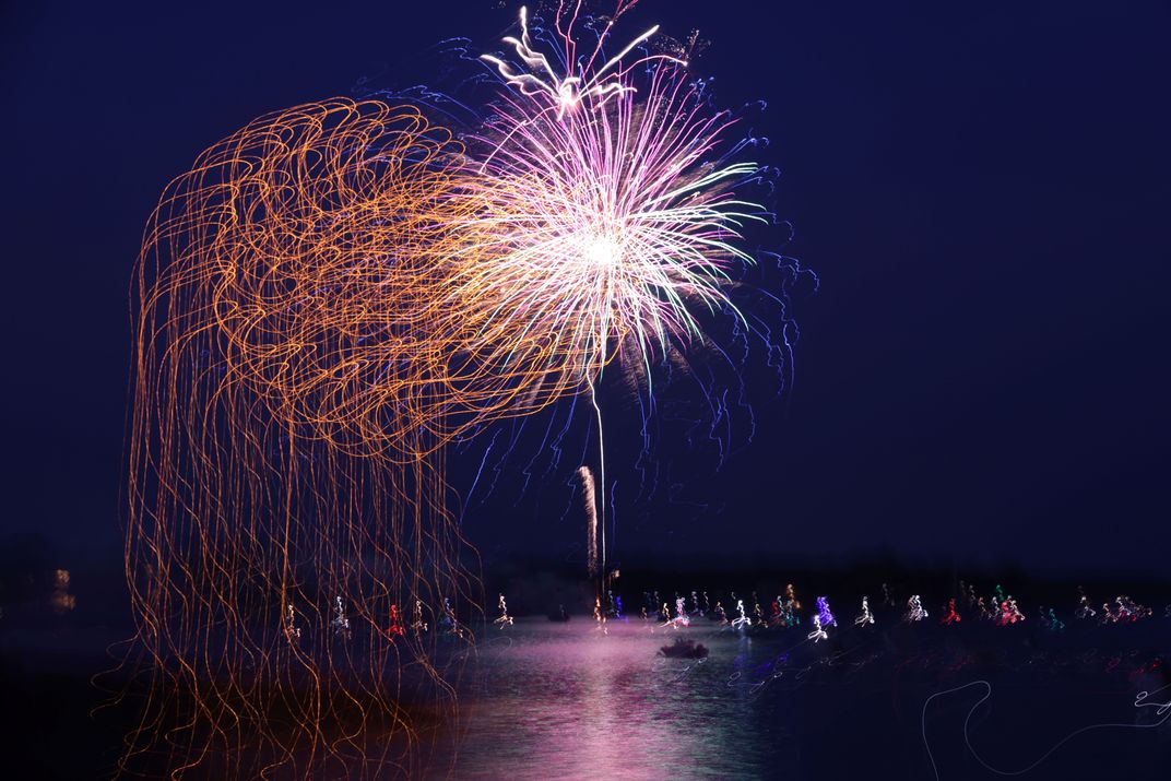 This photograph shows a golden firework unraveling like a willow tree over the harbor, its cascading trails mirrored in the water below. The shoreline silhouettes remind us of the people gathered together to watch, each face tilted toward the light. It’s a fleeting moment of awe — fireworks as both performance and poetry, shared in community.