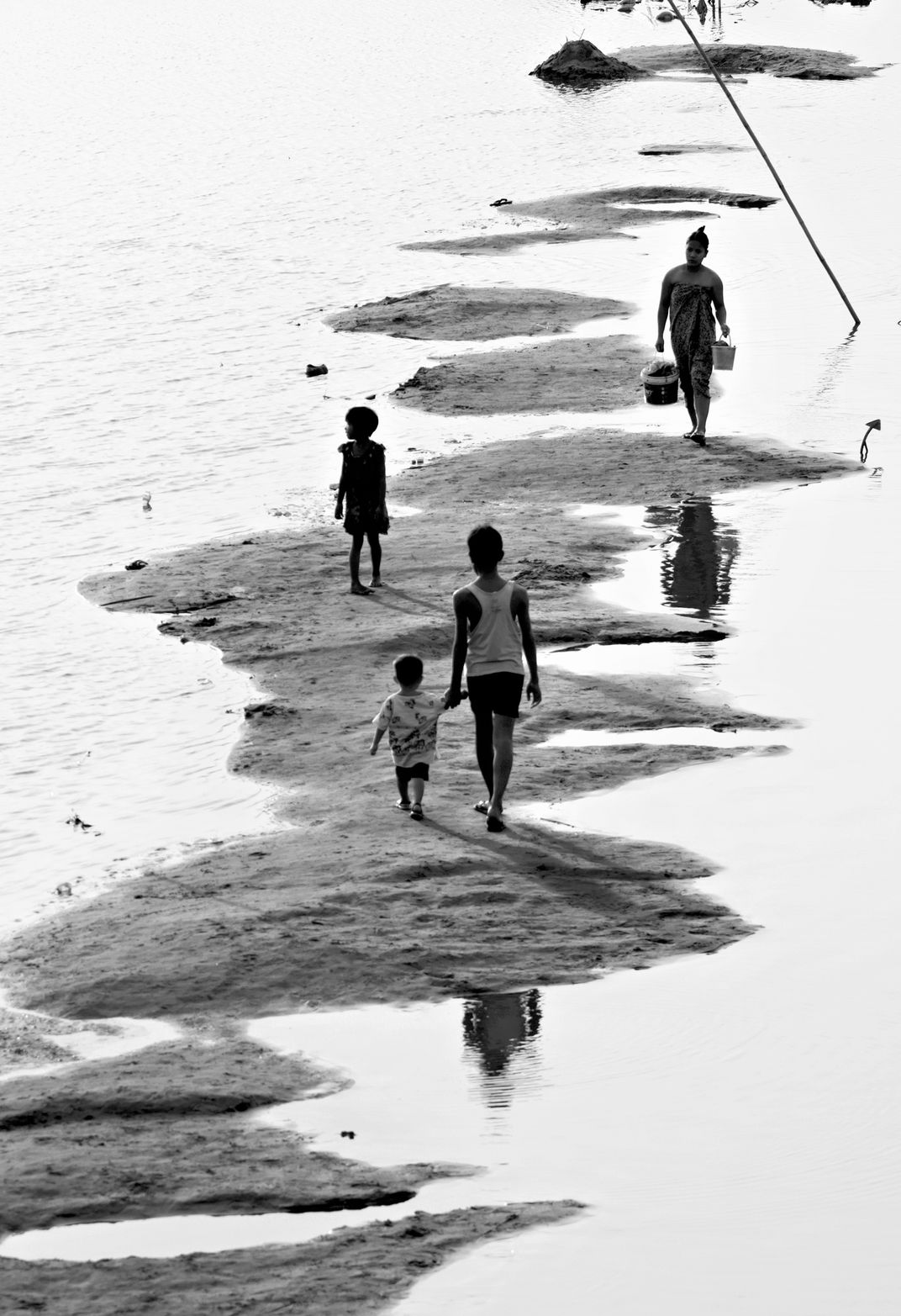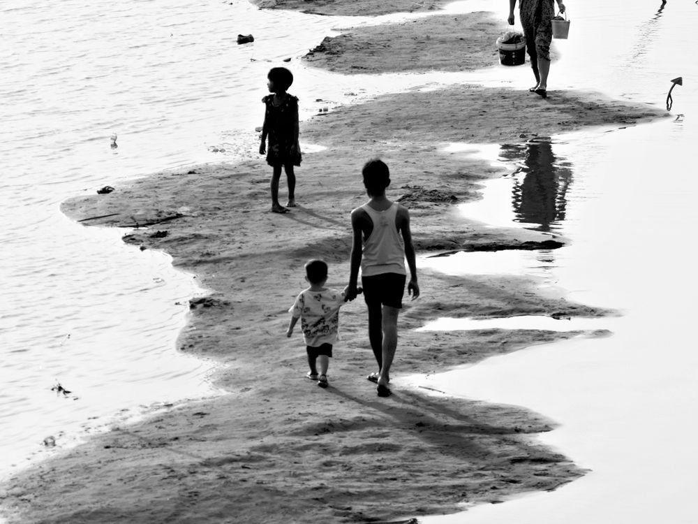 A mother and her children walking beside of the Irrawaddy river , they live beside of the river as a simple and poor life.