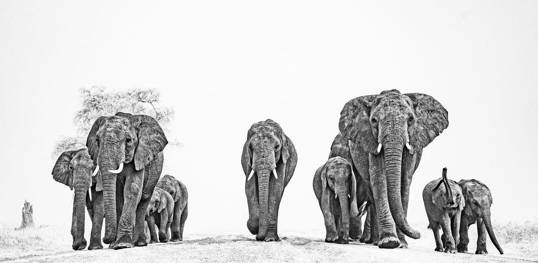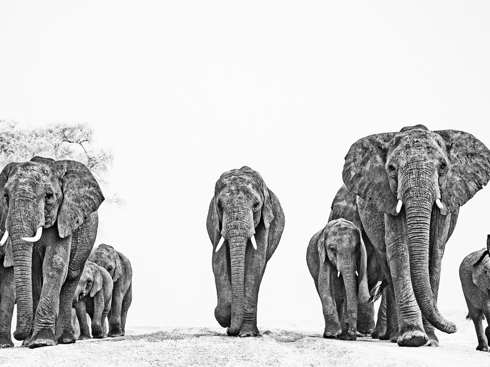 When I got up before dawn and drove to Musiara marsh in Maasai Mara, Kenya, I found a thick layer of morning mist covering the land. As I drove along a well-worn track, I saw a small family of elephants quietly emerging from the mist, lashing the air with their trunks, ears blowing like delicate petals, their flanks rippling, the close-knit family moving in easy, swinging strides. As the elephants moved steadily in a front toward me, the babies oblivious to my presence, the adults keeping a keen eye on me, all I had to do to execute this photograph of a contented family in harmony with the world, is wait for the best arrangement of the happy-go-lucky figures freshly formed.