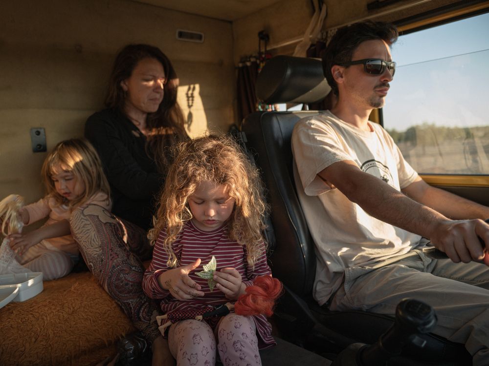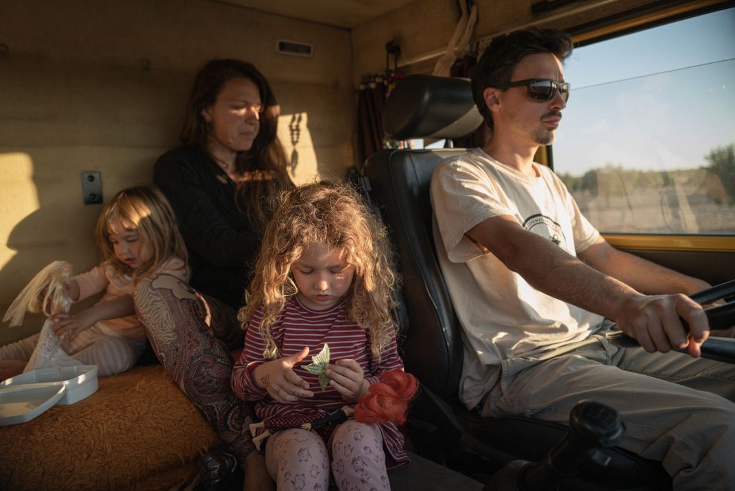 16 February 2023, Kairouan, Tunisia. The entire family of Le Cinema Du Desert travels along the roads of Tunisia in their truck converted into a mobile home. The cabin is divided into spaces for driving, relaxation, and work. While Davide drives and Francesca plans the routes, Zaira and Laila, the children, play cheerfully. They move from one town to another to organize film screenings in places where cinemas are not typically found, collaborating with local organizations. This desire for movement reflects the importance of shared knowledge and interconnectedness between people and their environment. It underscores the necessity of mutual collaboration for collective well-being through the screening of environmental and humanitarian films and documentaries. Projects are also carried out with the humanitarian organization NGO "Children in the Desert," of which they are members.