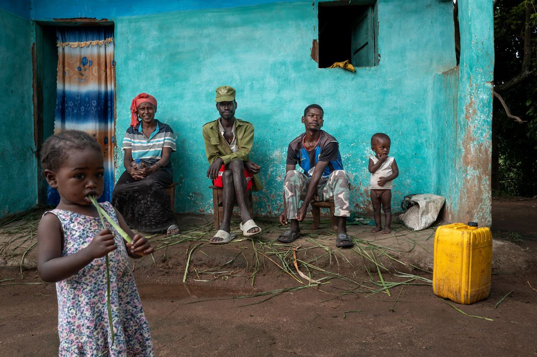 A family sits outside their turquoise home in southern Ethiopia. The youngest child plays in the foreground, grounding the scene in everyday life and quiet togetherness.
