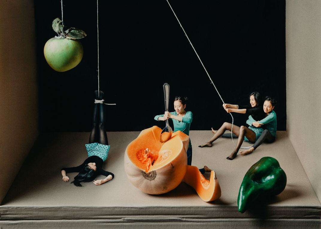 Inspired by "Quince, Cabbage, Melon and Cucumber" of Juan Sánchez Cotán, with humour, this reinterpretation with self-portraits explores love, hatred and indifference in close relationships and how all this can happen at the same time.