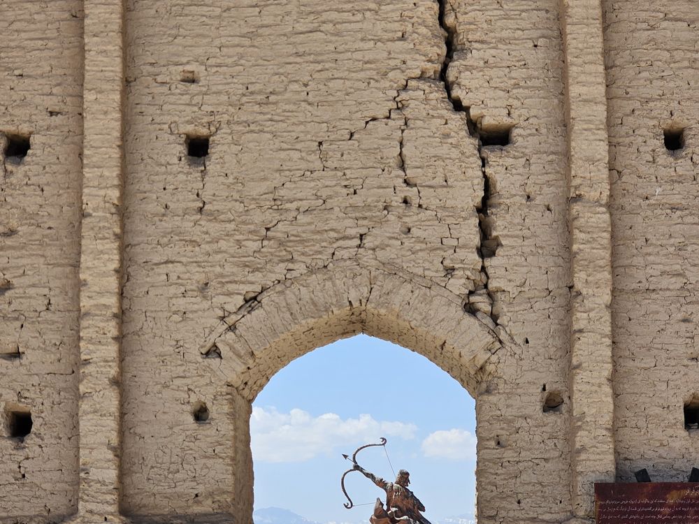 Through the cracked adobe gateway of Farafar Gate in the ancient city of Saryazd, a lone statue emerges in the distance—frozen mid-motion, yet full of tension and life. The fractured wall frames the sculpture like a silent witness to centuries of history, creating a dialogue between decay and resilience, stillness and movement. This photograph explores the contrast between earth-built architecture and the dynamic form beyond it, revealing how time shapes both art and structure.