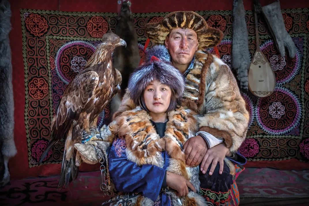 Portrait of Kazakh eagle hunters (Mongolia). Kazakh eagle hunters are a group of skilled hunters from the Kazakh ethnic group, primarily found in the western regions of Mongolia. The practice of eagle hunting is a central part of their cultural heritage and identity, passed down through generations among the Kazakh people for centuries. Eagle hunters typically capture and train female golden eagles because they are larger and more aggressive than their male counterparts. The training is a meticulous and time-consuming process used by hanters to establish a strong bond with their eagles. To hunt, the hunter typically releases the eagle from a high point. The eagle circles in the sky, scanning for potential prey. When a suitable target is spotted, the hunter gives a command, and the eagle swoops down to capture it. The hunting season for Kazakh eagle hunters typically takes place during the colder months of the year, from late autumn to early winter. Eagle hunters wear traditional clothing, including fur-lined coats and hats, to protect themselves from the harsh winter conditions. A special leather gauntlets is used to protect their arms when handling the eagles. Eagle hunting is not only a practical skill but also holds immense cultural significance for the Kazakh people. It is often celebrated through festivals and competitions, such as the Golden Eagle Festival, where eagle hunters showcase their skills and the bonds they have with their eagles.