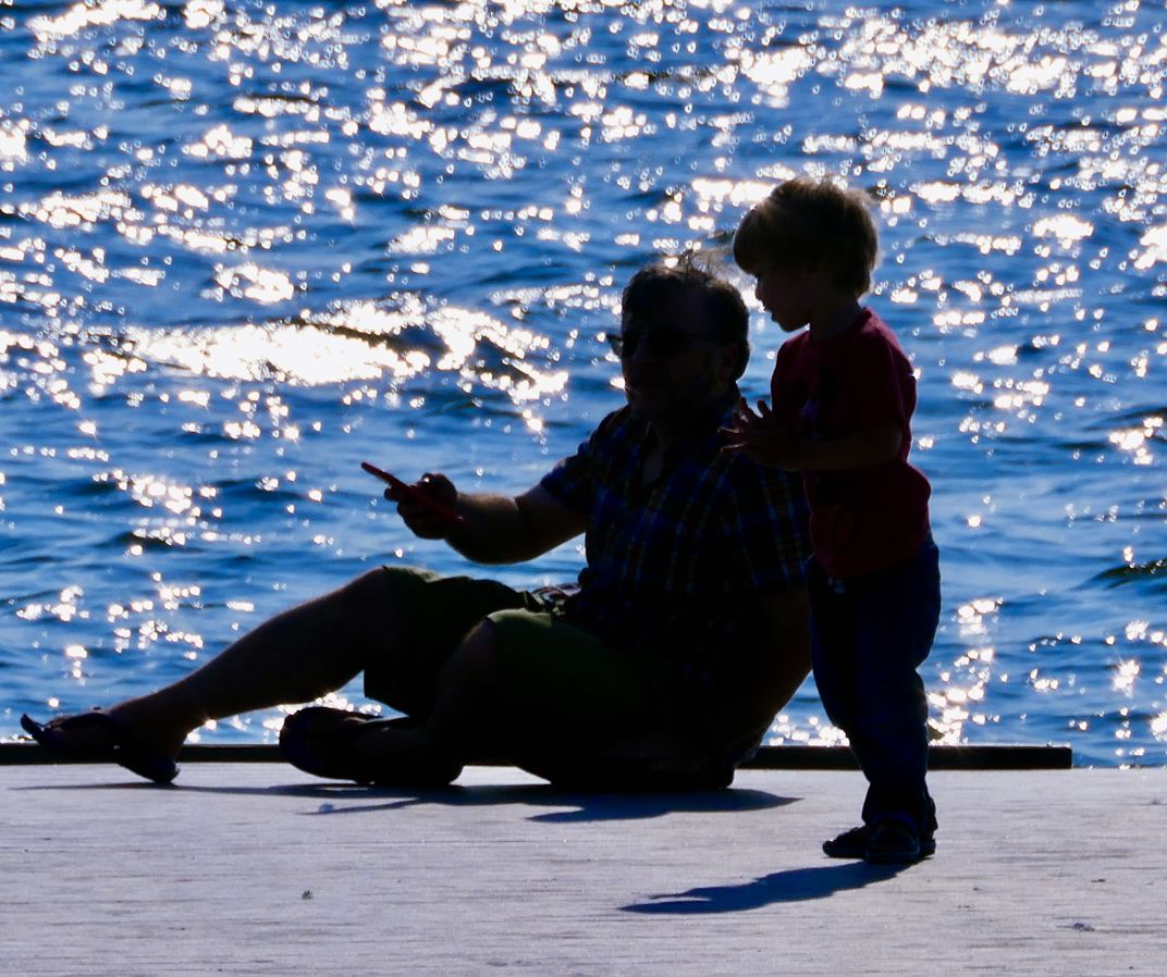While walking around the lake I happened to see this father and his son out on a pier/walkway at the edge of the lake. The boys inter-action with his father seemed something special and they made for a interesting silhouette.