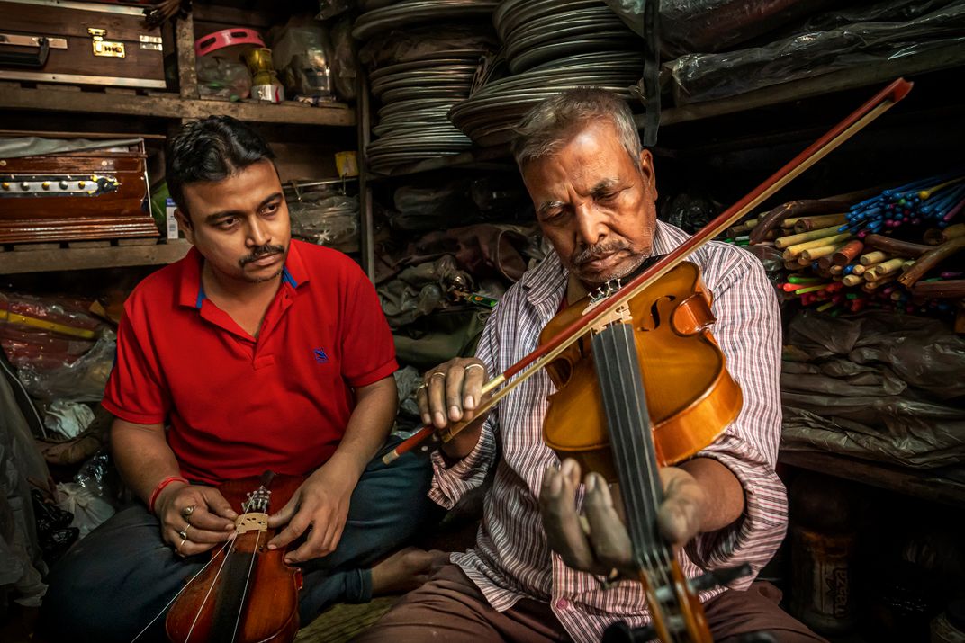 In their small musical-instrument workshop cum sales store, while the father is engrossed in fine-tuning of the violin before clearance for sale, the onlooker son is keenly observing the procedure for understanding the nuances of such technique. Business of such instrument-maker(especially the classical ones) families, run through generations from the imparting of hands-of knowledge from seniors to progenies.