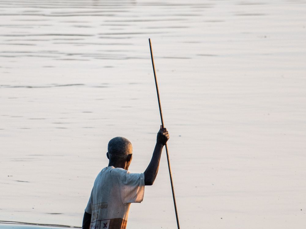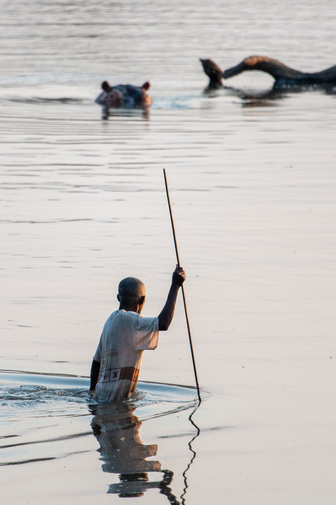 A fearless fishermen crossing Zambia’s Luangwa River. Even though the Luangwa river has the world’s largest concentration of hippos and is packed with crocodiles, the local fishermen continues to set their nets in the river and paddle their canoes. They cross the river by feet, sometimes up to their breast, fearless of the dangerous wildlife around them.