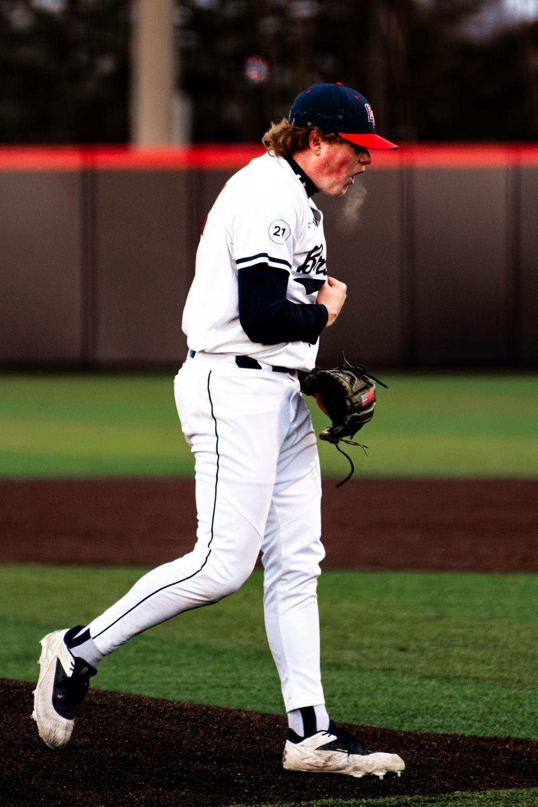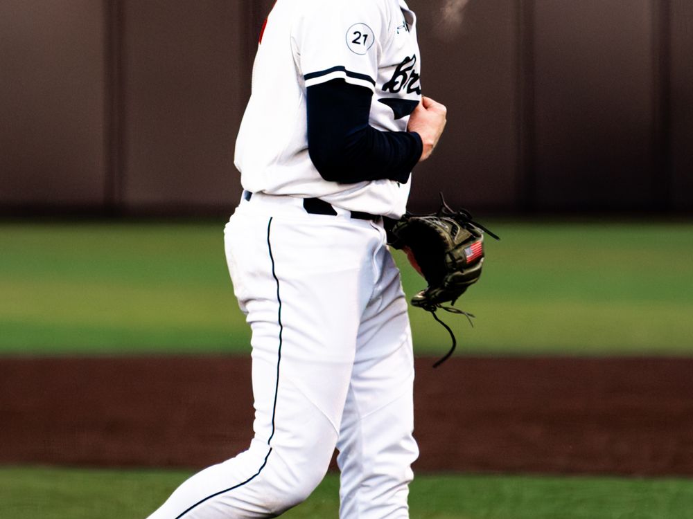 Belmont Bruins #27 Will Pryor cheers after pitching a strikeout in the six inning against the Kentucky Wildcats at ES Rose Park in Nashville, TN on February 21, 2025.