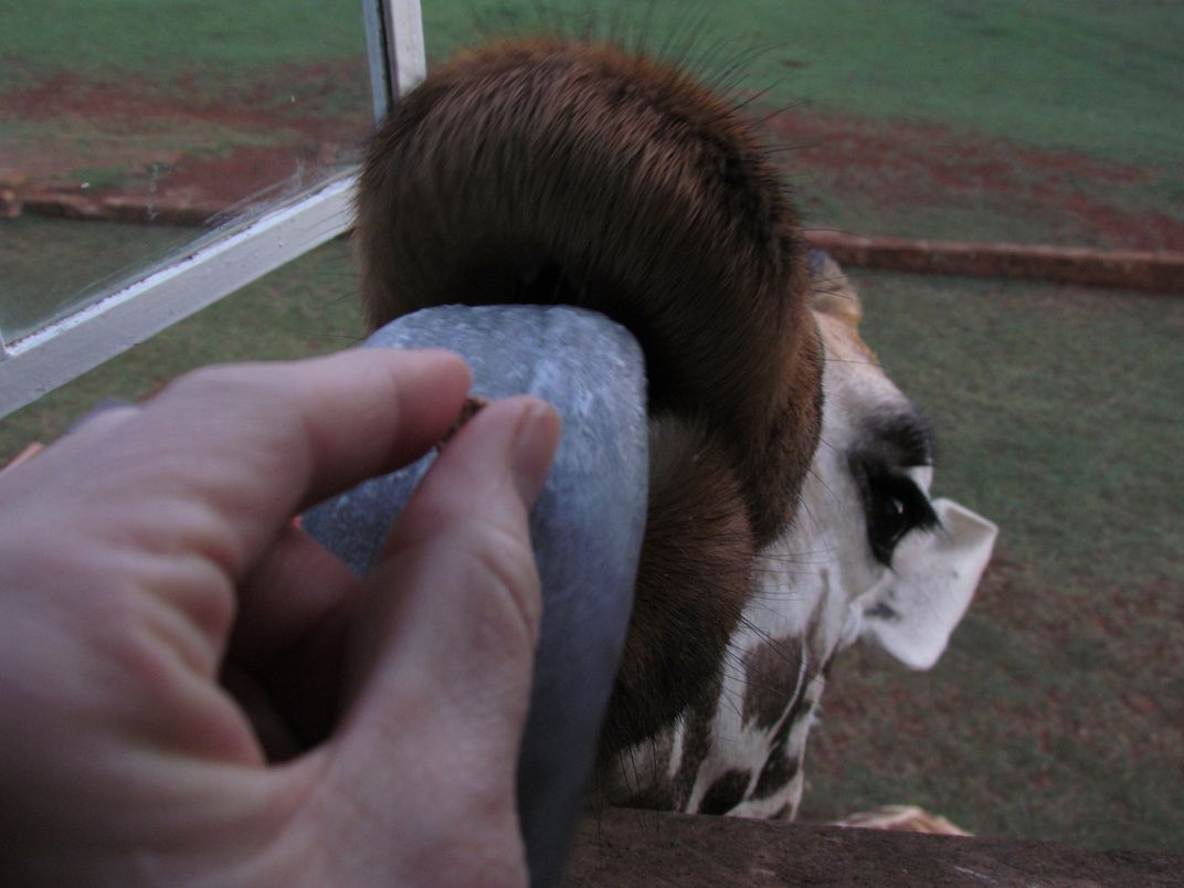 Feeding a giraffe from the second floor of the Giraffe Manor near Nairobi, Kenya
