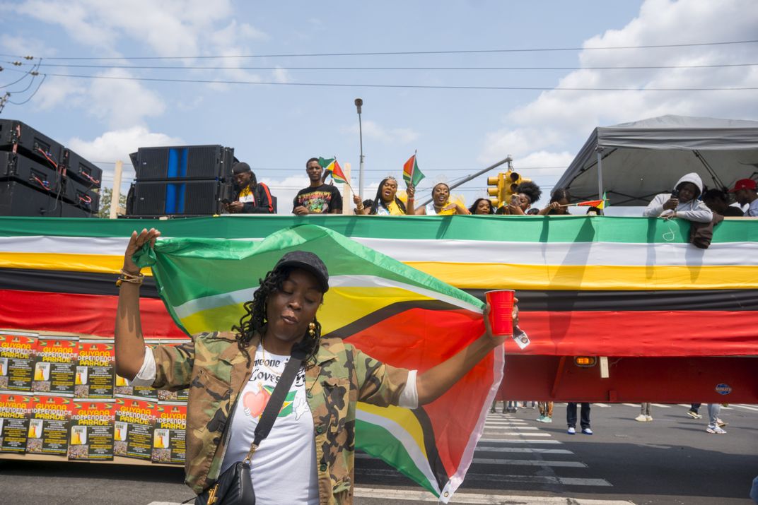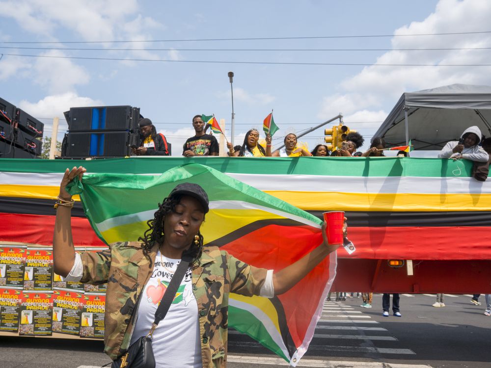 A woman dances beside a float at a Guyanese independence parade in NYC.