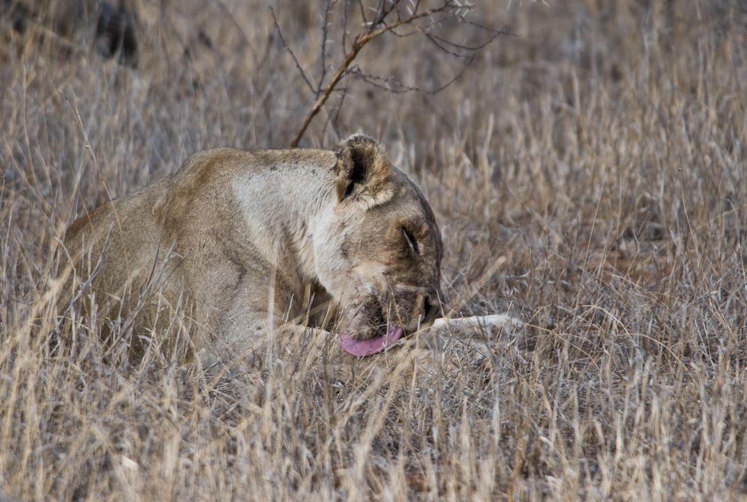 Female lion in the bush preening herself.