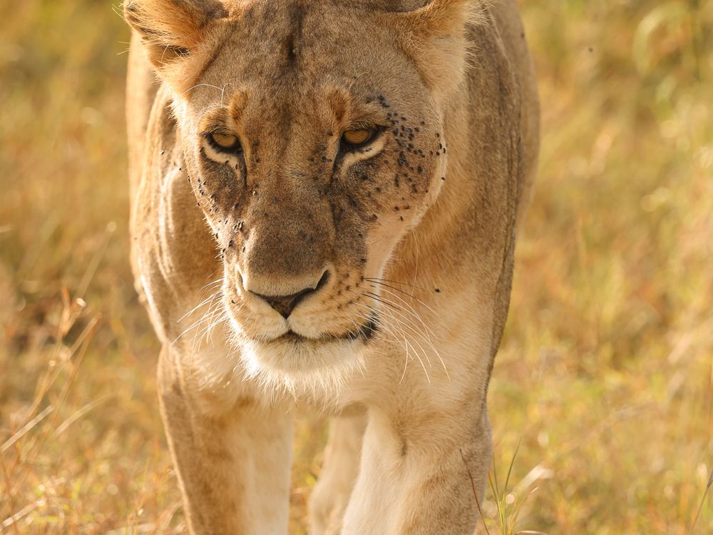 Lioness walking through the long grass of the Masai Mara, Kenya