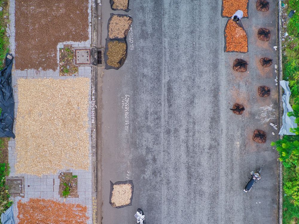 Pieces of rice straw, coconut husk, leaves, small sticks, grass, twigs are left in the sun to dry. All these parts will be used as organic fertilizer to grow mushrooms.