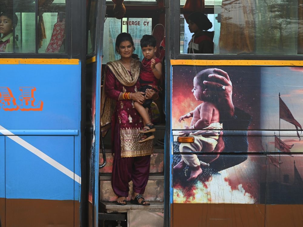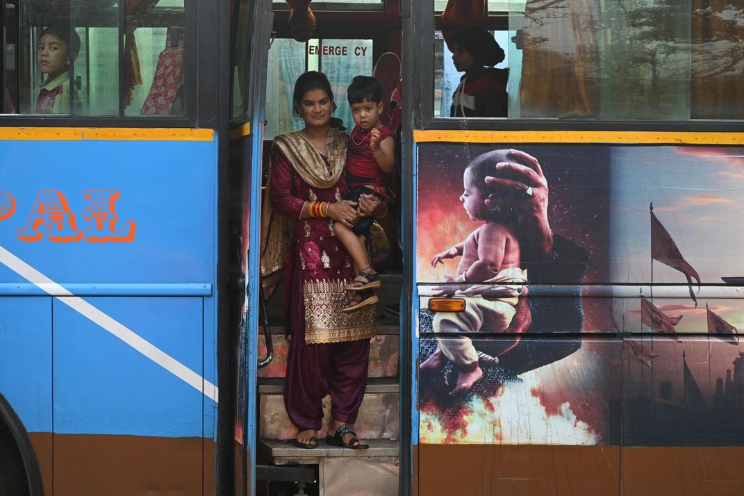 The photograph tries to juxtapose filial love of a father and a mother. The picture of masculine hands holding an infant probably suggests the care and love of a father. The woman on steps of the bus coming down with her child shows motherly affection.