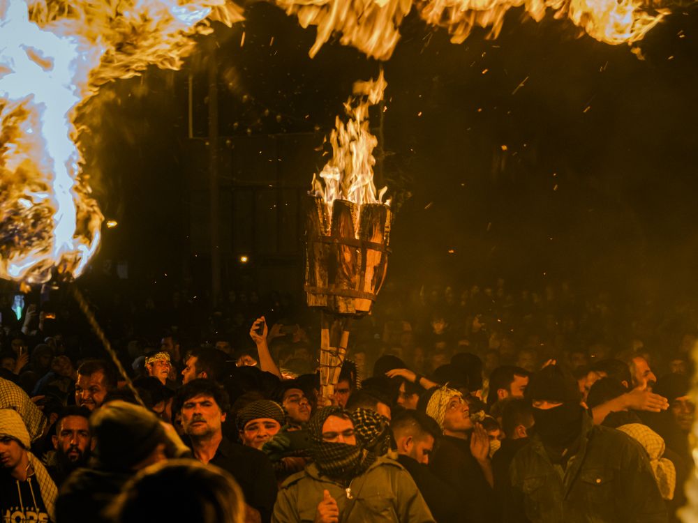 According to many, the fire-spinning ritual of the people of Shishvan symbolizes the burning of Imam Hussein’s (peace be upon him) tents on the night of Ashura. In this ceremony, a large main torch is lit in the center of the square, in front of the village’s Grand Mosque, so that people gather around it. The mourners, similar to when they pass beneath the ‘Alam,’ go one by one under this torch, followed by two others—one carrying a bucket of water and the other sprinkling water from the bucket onto the fire torch to cool it down. After the main torch is placed in the center, smaller torches belonging to other neighborhoods are brought from the front of the local mosque to the main square by the mourners. They light these smaller torches with the flame of the main torch, holding them with long chains, and then rotate them above the heads of the participants.