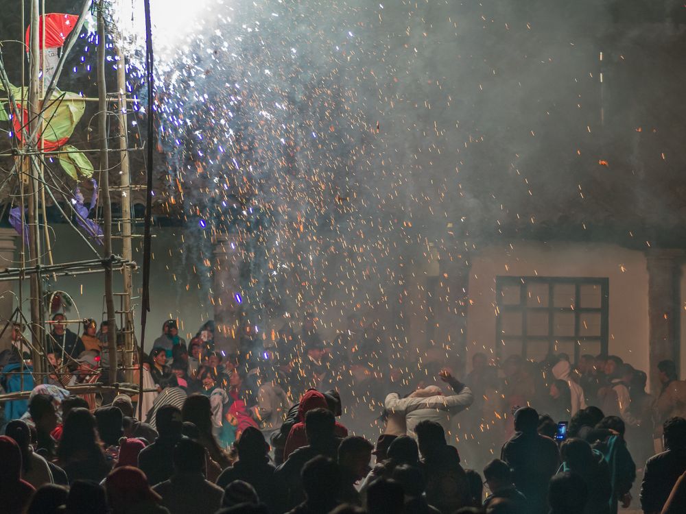 Astonishing handcrafted bamboo structures charged with vast amounts on fireworks and intricate motion mechanisms are a well-kept tradition in the Andean region of Ecuador. Here we see a display of home-crafted pyrotechnics during the celebration of new year's eve at the community of Zuleta. While the castle burns and explodes it displays a marvelous show of light and fire showers under which people dance around.