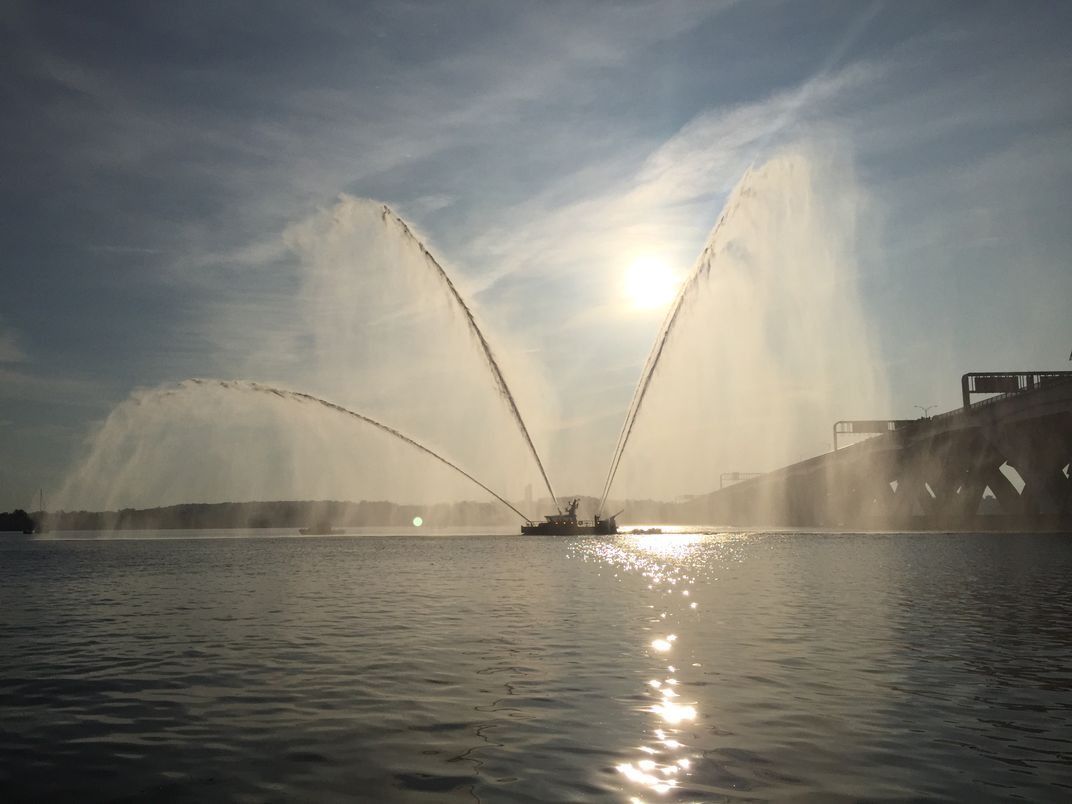 Alexandria City Fire Department boat sprays water as it leads the way for the US Coast Guard boat Eagle.
