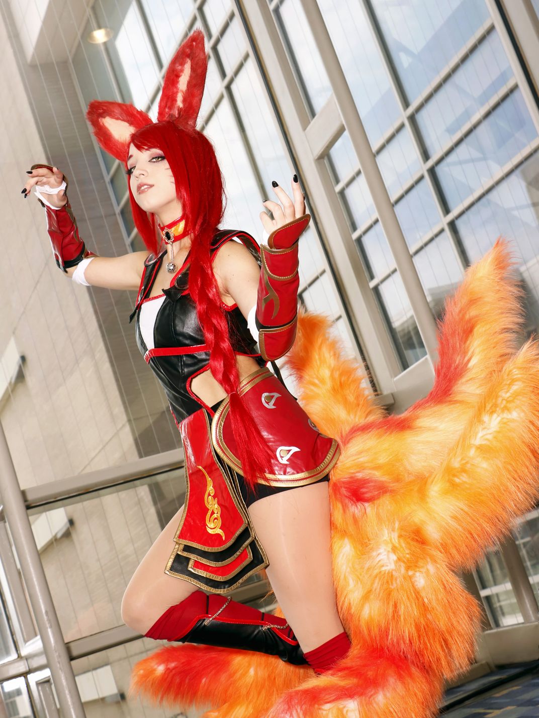 A "cosplay" photo of a young woman dressed as "Firefox Ahri" from The League of Legends on-line game series.
