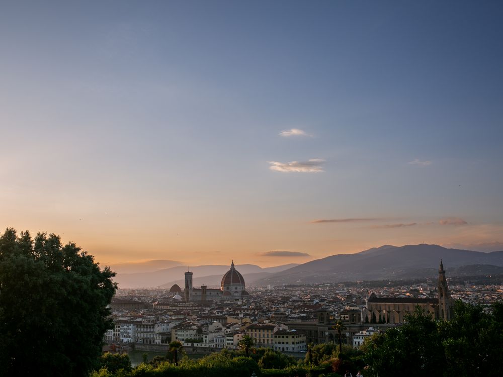 A view of Florence, Italy, at dusk, featuring the Cathedral of Santa Maria del Fiore.