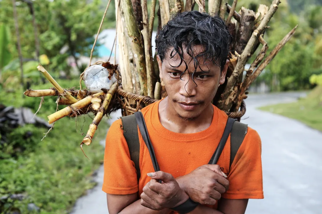 A Bajau man carries firewood to his village in Peling Island, Indonesia. On the coral islands of Sulawesi region, wood is often harvested from coastal mangrove forests, adding another threat to this already endangered ecosystem.