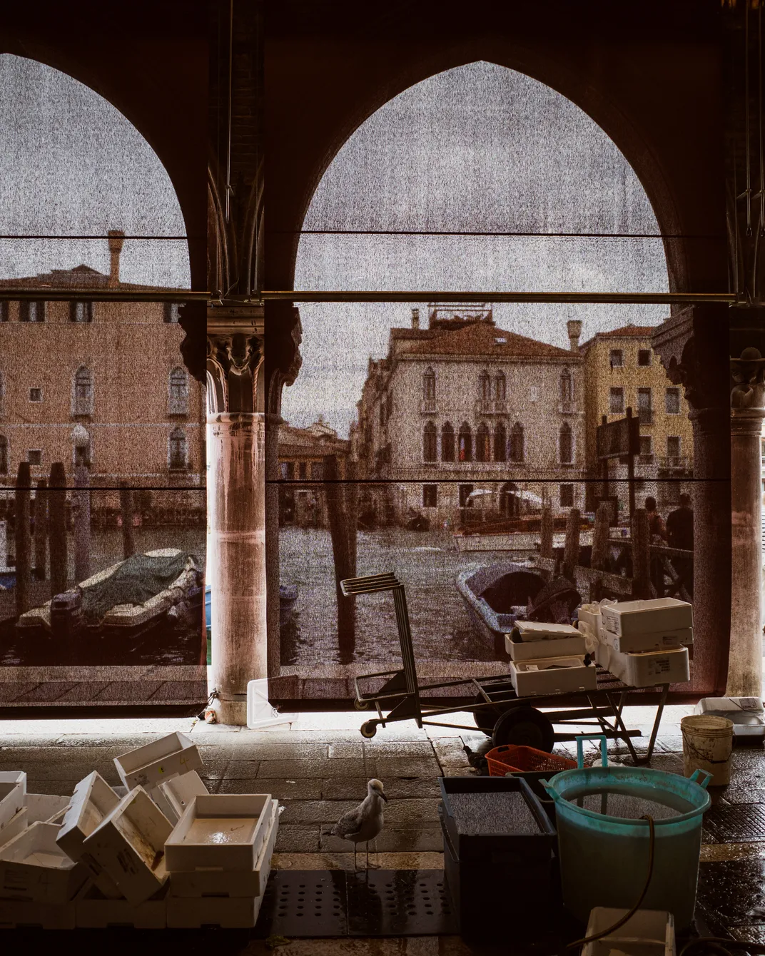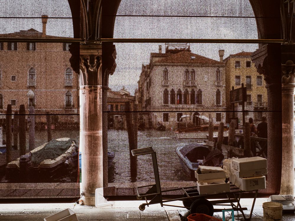 The view of the Grand Canal through the dark blinds of the Fish Market in Venice.
