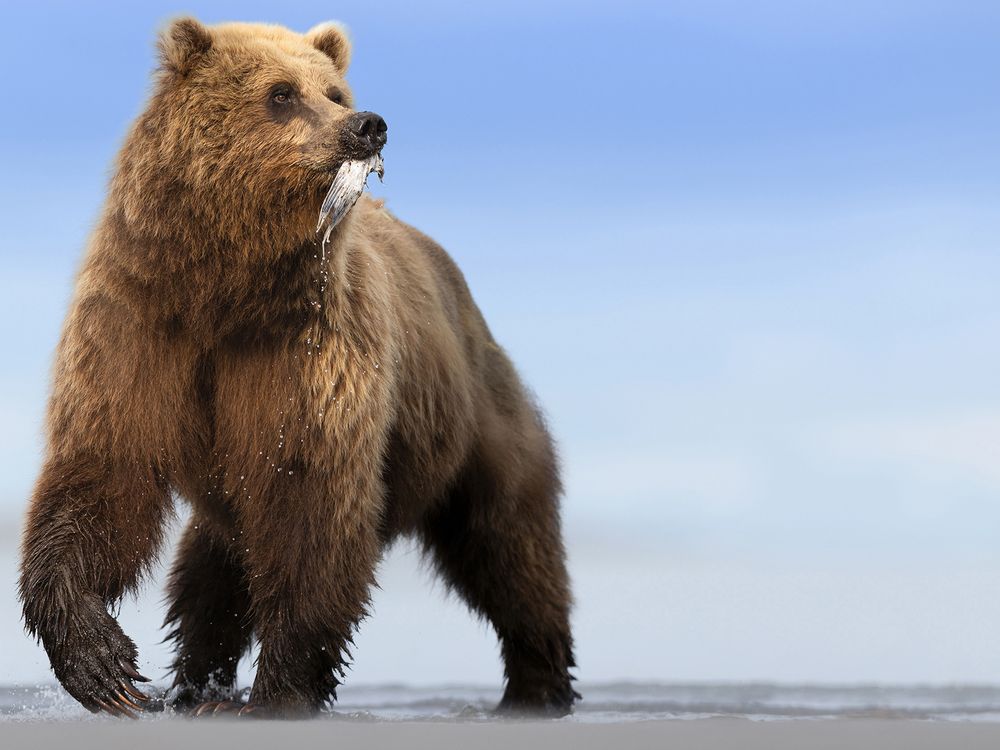 The salmon had yet to run but this individual coastal brown bear got lucky where a creek met the sea. Very quickly his fish of the day was demolished, with just the fishtail remaining.