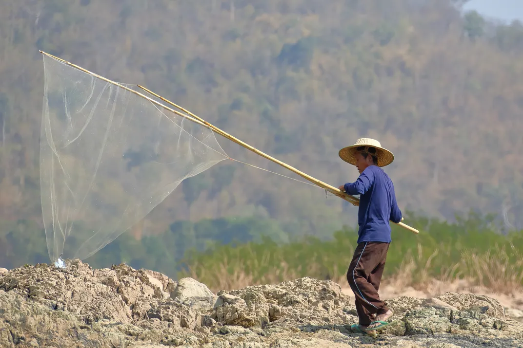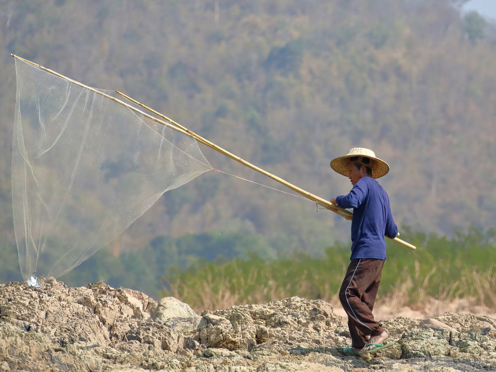 I was on a small group trip on the Mekong River in Laos. ON this day we had to switch to a local long boat to reach Vientiane, as the river was too shallow for our regular boat to reach Vientiane. I spent as much time as I could outside taking pictures of scenes along the river. I saw that this fisherman had caught something, and was able to get the shot.