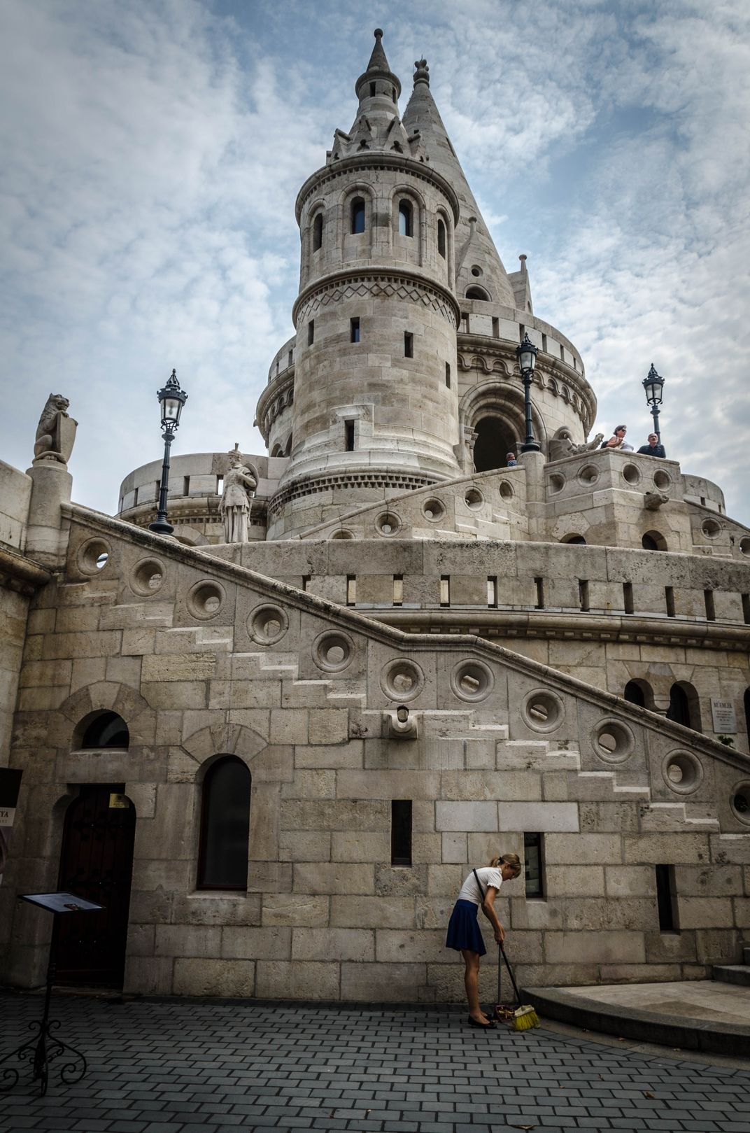 The image shows a young woman sweeping in front of one of the towers of the fisherman's bastion.