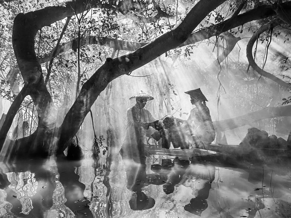 In a quiet forest, two fishermen are fishing in the still waters, framed by towering trees. The sunlight pierced through the canopy, forming sharp rays that danced in the mist. Captured in black and white, the scene becomes timeless where light, shadow, and human presence blend into a poetic moment of solitude and nature.