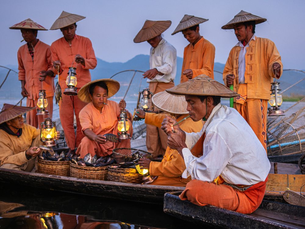 Fishermen on Inle Lake gather with lanterns as evening settles in. They sort their fresh catch and share a brief pause together, illuminated by warm light that reflects their rhythm of work and community on the water.