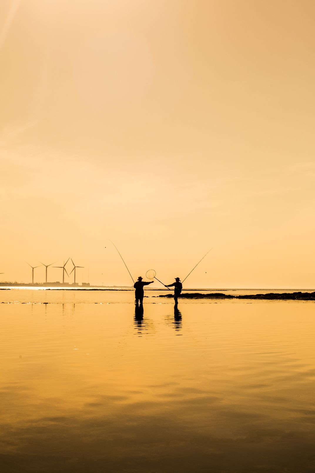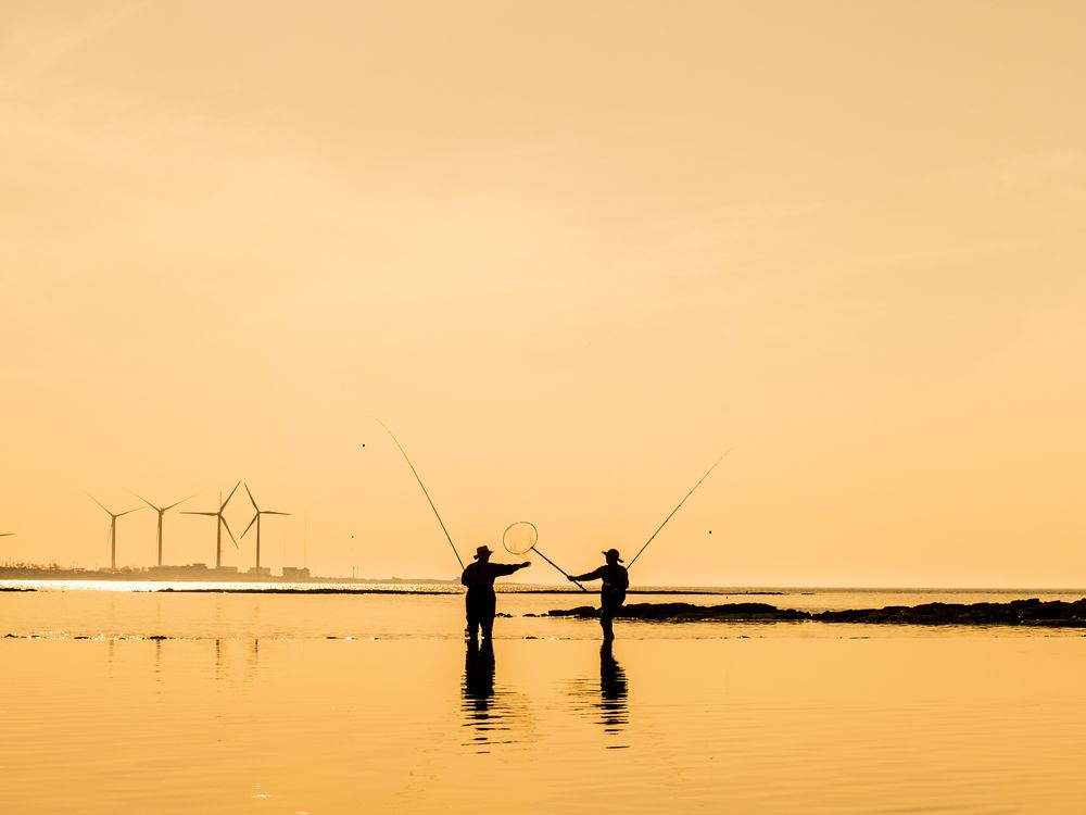 This photo was taken in Jeju Island in South Korea. Two fishermen were fishing while wind turbines in the background were trying to catch some wind. Without sustainable energies, there will be no such thing as fisherman.