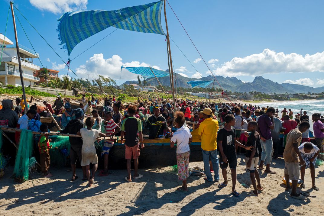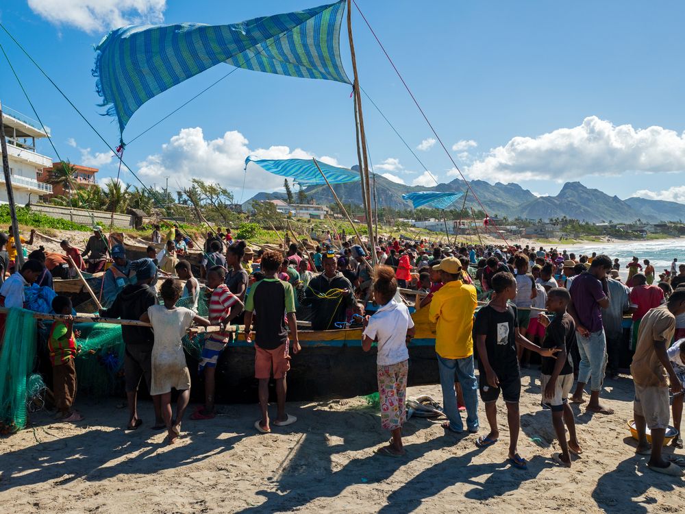People have gathered at the beach of Tolagnaro to welcome the fishermen with their catch returning from the bay.