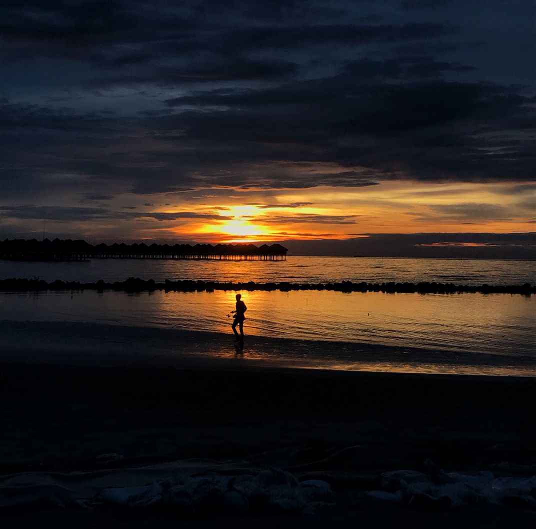This picture was shot at Bagan Lalang Beach in Sepang, Malaysia. It shows a fisherman fishing from shore during sunset