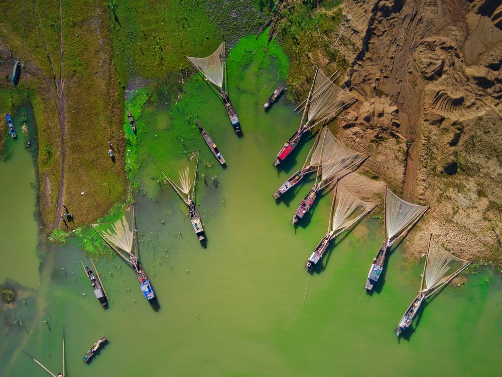 In Bến Nôm village, locals are placing the fishing nets in front of the boats. Viewed from the top looks like fish.