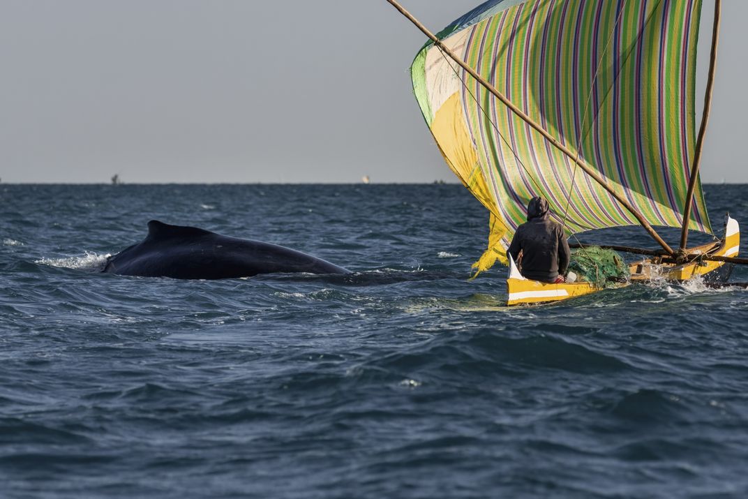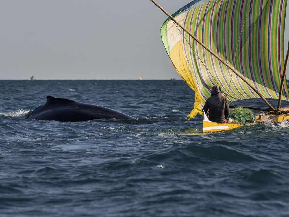 Off the coast of Madagascar, a whale surfaces beside a traditional pirogue.