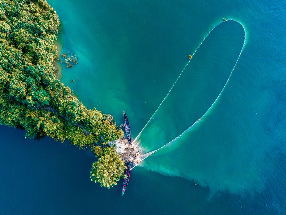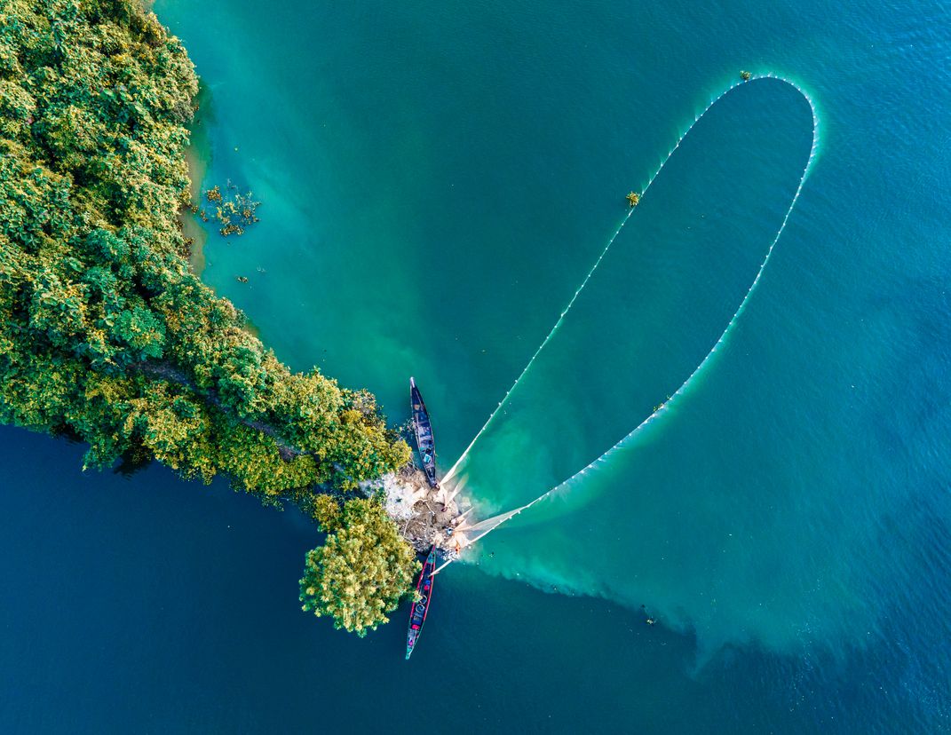 Aerial view of local tribal fishermen spreading colorful nets from boats in Kaptai Lake, Rangamati, Bangladesh—a portrayal of the harmony between tradition, nature, and community livelihood.