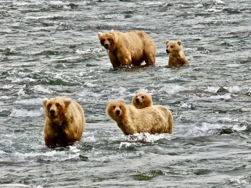 Two mother bears took their cubs out for a lesson in fishing for salmon at Brooks Falls. The mothers were challenged as each cub went its own way. I stood at attention trying to get them in one image. Suddenly, they all entered the frame and even bared their faces for me!