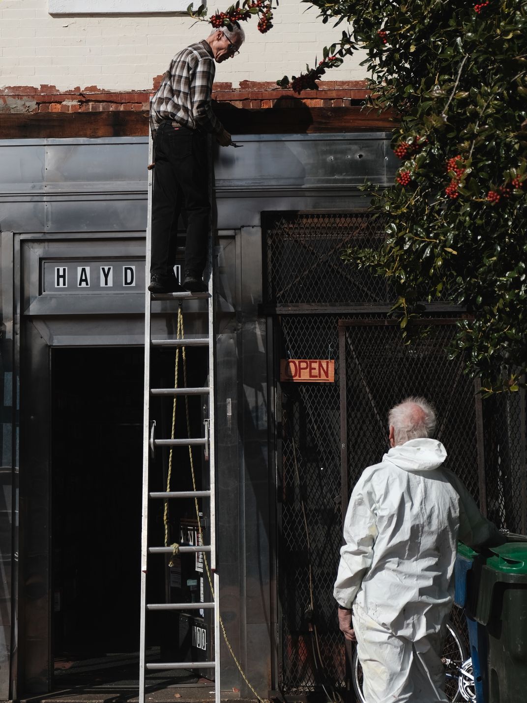 Two men are spotter painting and doing maintenance work to the outside of a small shop in Southeast, Washington, D.C.